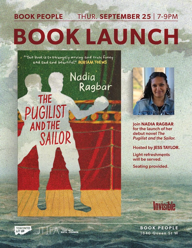 Nadia Ragbar lives in Toronto with her partner and son. Her short fiction has appeared in Broken Pencil and This Magazine, among other outlets. Her flash fiction appeared in The Unpublished City, an anthology curated by Dionne Brand, which was shortlisted for the 2018 Toronto Book Award. The Pugilist and the Sailor is her first novel.